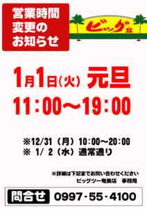 新年のご挨拶 update:2019.01.01 新年あけましておめでようございます。 奄美は、いつもよりあたたかいお正月を迎えました。 昨年はたくさんのお客様に支えて頂き厚く御礼申し上げます。 弊社は新年あけまして1月1日のみ営業時間を変更しての営業を行っております。 ご不便をおかけいたしますがご了承のほど宜しくお願い致します。 なお、1月1日~1月3日の間はイベントをご準備し皆様のご来店をお待ちしておりますので ご家族、ご友人とのご来店を心待ちにしております。 2019年元旦